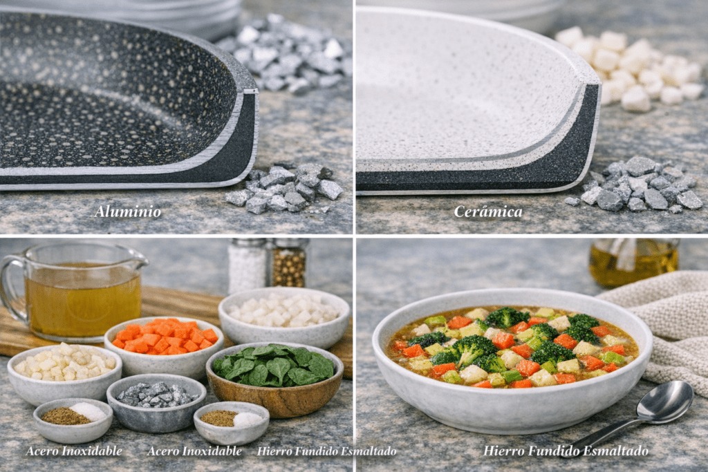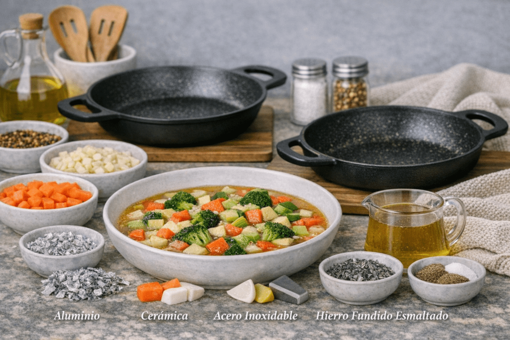 Sartenes de aluminio: Estas sartenes son ligeras y conducen el calor de manera uniforme, lo que las convierte en una excelente opción para cocinar a fuego medio. Son ideales para preparar platos que requieren un control preciso de la temperatura. Sin embargo, es importante elegir modelos de buena calidad que cuenten con un recubrimiento antiadherente duradero para evitar que la comida se pegue y la sartén se desgaste rápidamente.